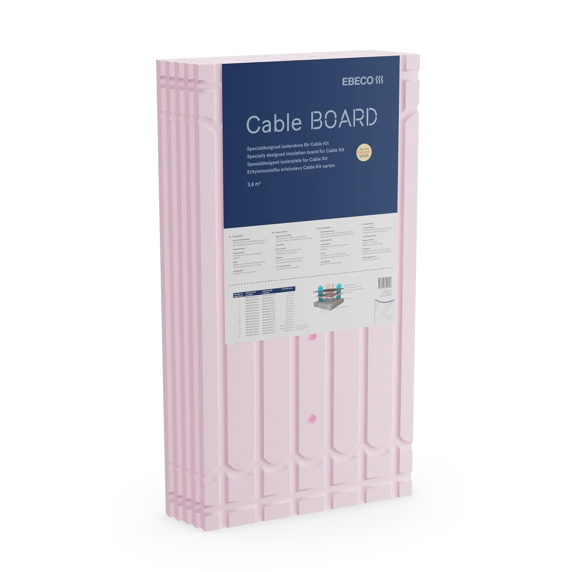 Cable Board ist eine Dämmplatte aus extrudiertem Polystyrol und hat mit ausgefrästen Nuten mit einem Mitteabstand von 10 cm eine Spezialform für Cable Kit. Die spezielle Struktur der Platte reflektiert die Wärme sehr effektiv nach oben. Im Vergleich zu einem Referenzsystem ohne Dämmung sinkt der Energieverbrauch um bis zu 45 %. Die Löcher in der Platte lassen gegebenenfalls Feuchtigkeit hindurch. Die Dämmplatte ist leicht und robust, und durch die Nuten lässt sich das Kabel problemlos mit genau richtigem Abstand verlegen. Befestigungsband ist nicht im Lieferumfang enthalten.