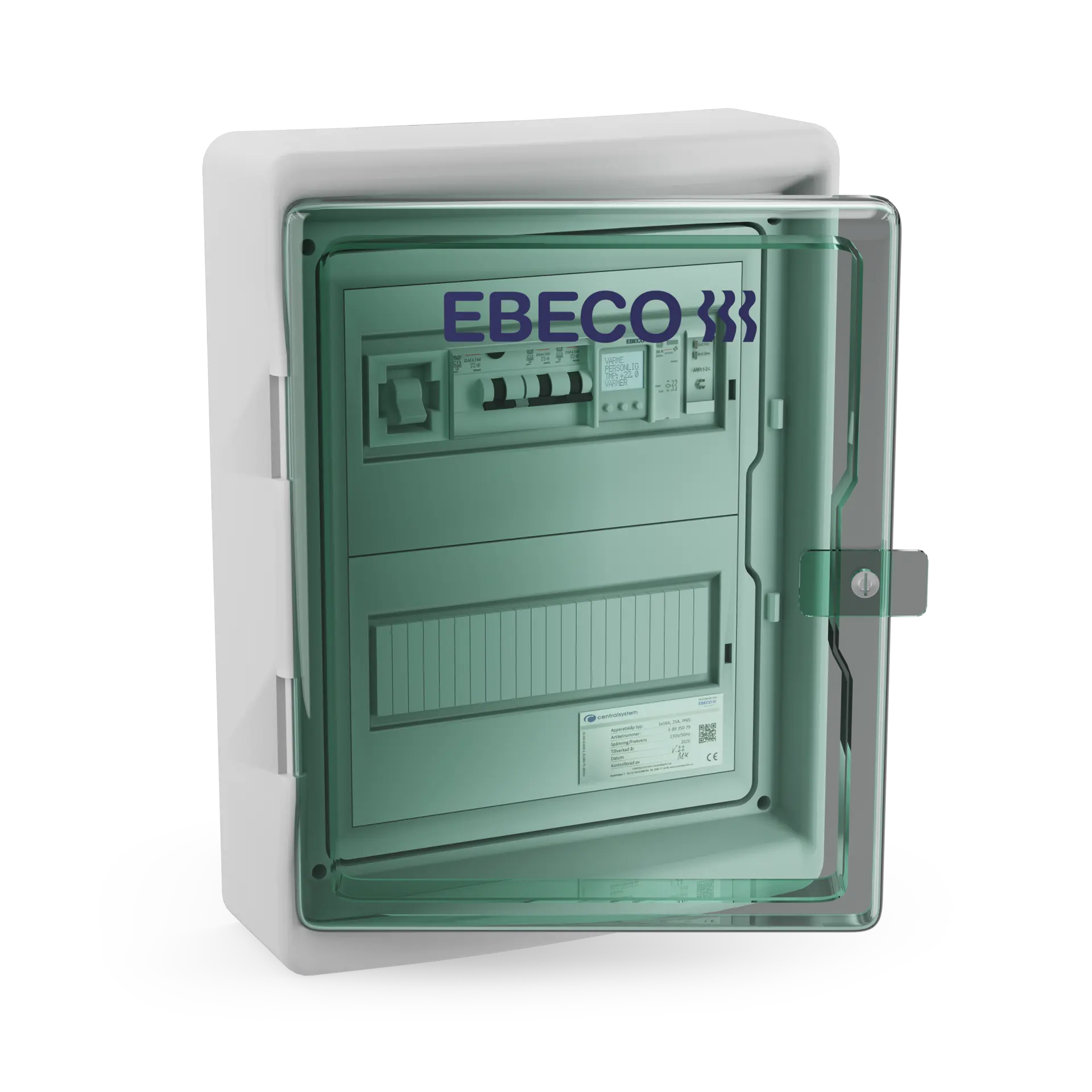 Geräteschrank mit Thermostat EB-Therm 800. Enthält außerdem Hauptschalter, Erdschlussschalter mit Alarmkontakt, automatische Sicherungen, Schütze, Schalter, Transformator, 3 m Sensorkabel (Temp), Klemmen und Handbuch EB-Therm 800 sowie Standardzeichnung. Der Schrank ist für Boden-/Decken-/Temperatursensoren vorbereitet. Der Thermostat verfügt über einen eingebauten Betriebsstundenzähler.