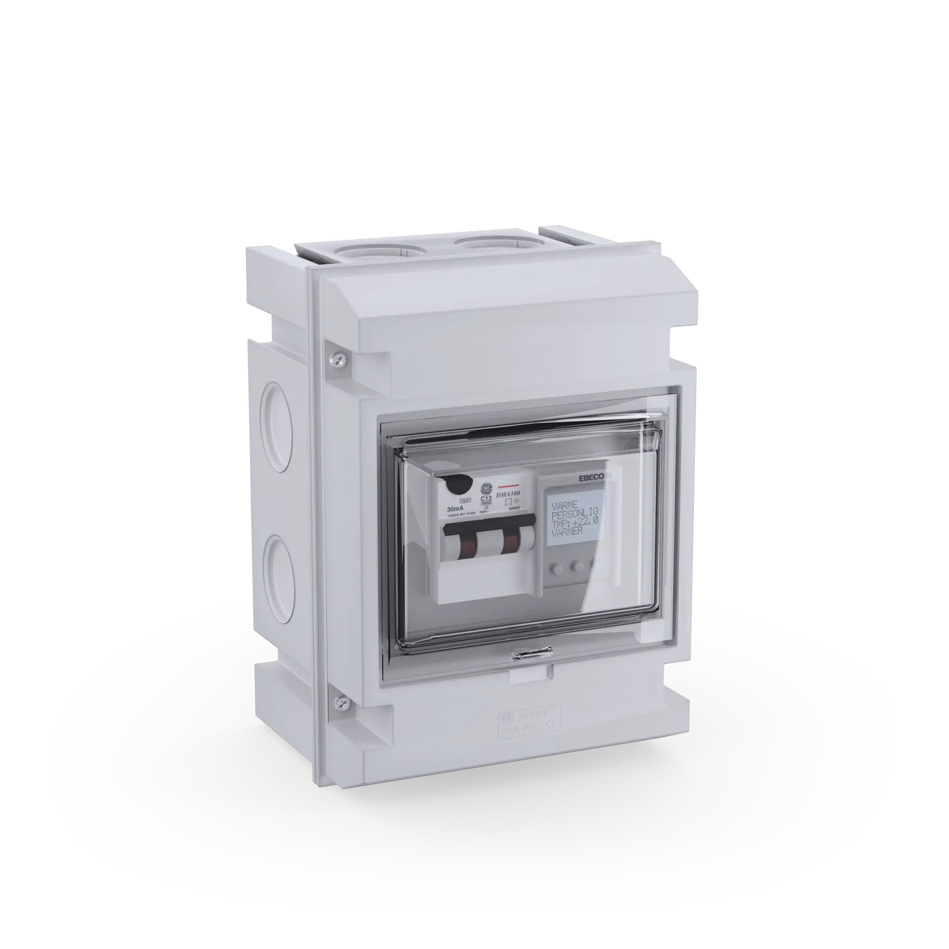 Apparatskab med termostat EB-Therm 800. Indeholder også en personbeskyttelsesautomat, klemme til udgående last og sensor.