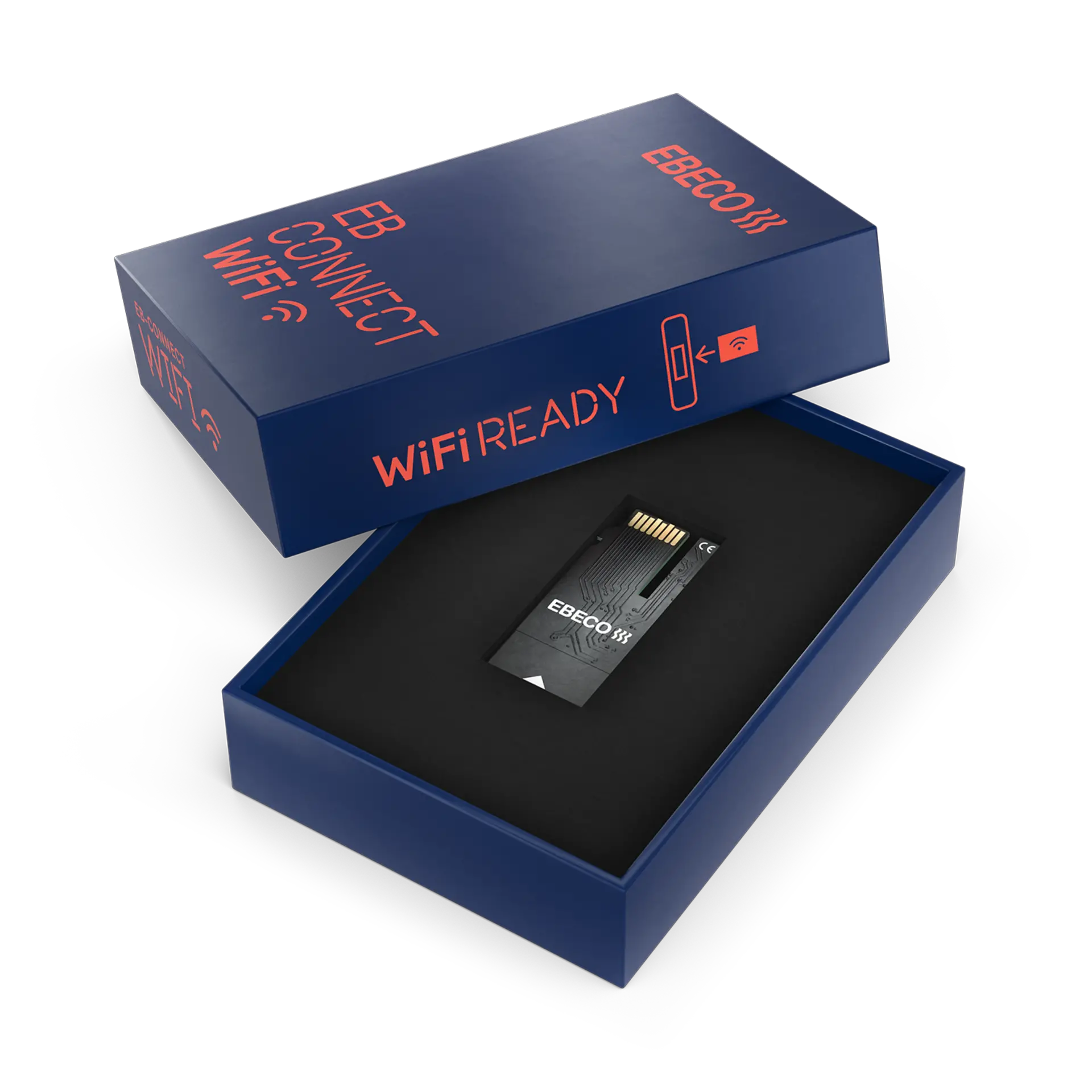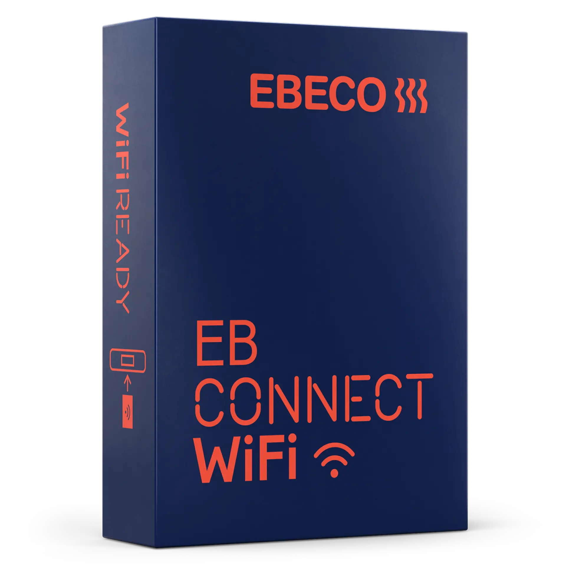 EB-Connect WiFi spiller en vigtig rolle i vores koncept ”WiFi READY”. Ved hjælp af wi-fi-modulet, der med et enkelt håndgreb sættes ind i termostaten eller elradiatoren Wallflex 500, kan disse opbygges i et system, der kan styres via appen Ebeco Connect eller det åbne API. I appen vises energiforbruget på en overskuelig måde, samtidig med at funktionerne årskalender og alarm via push-beskeder eller mail bliver tilgængelige. Alle termostatens funktioner kan tilgås via appen.
