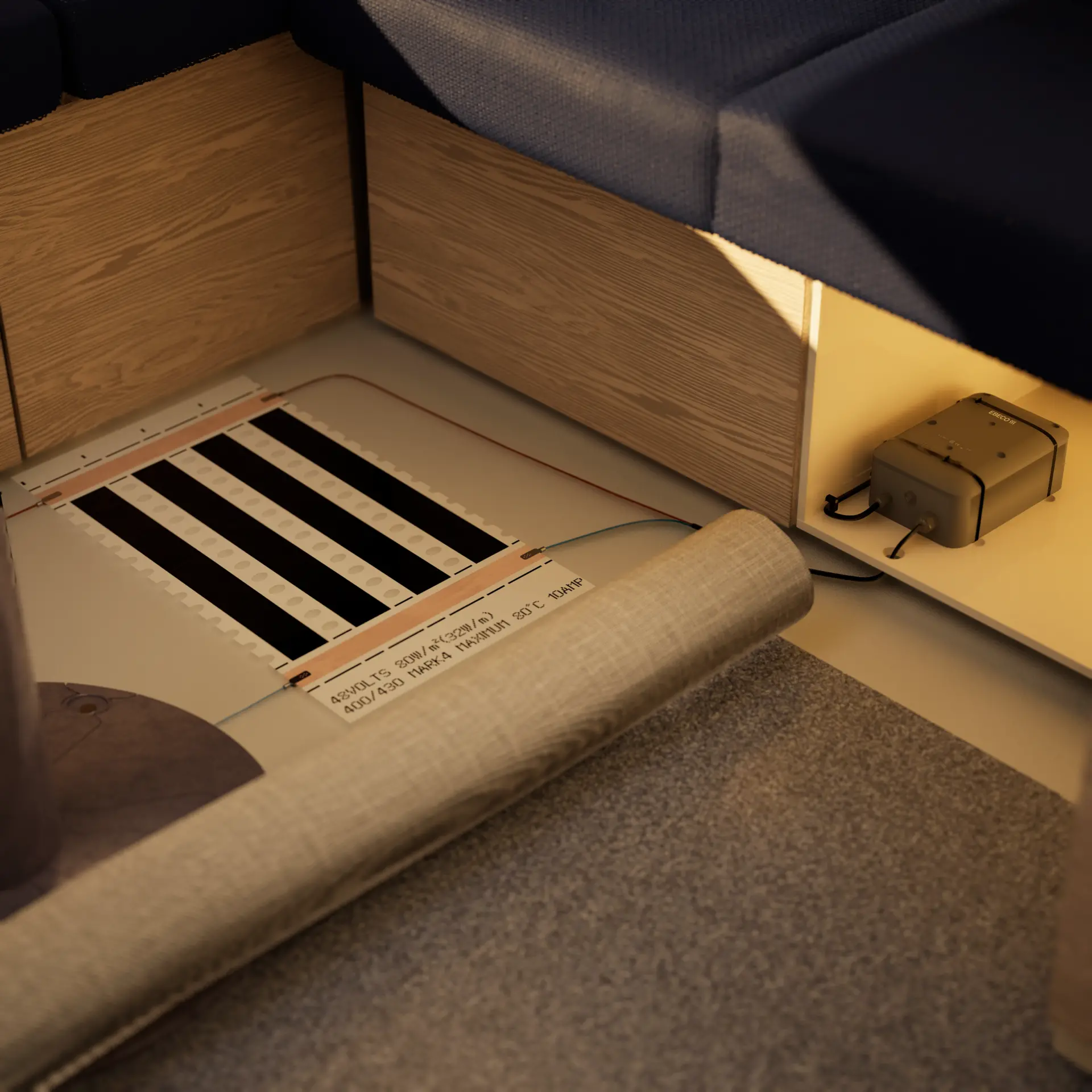 48 V lämmityskalvo sopii erityisesti asuntovaunun/asuntoauton lattialämmitykseen. Puu- ja laminaattilattioille sekä muovimatoille. Kalvo voidaan asentaa vain kuiviin tiloihin. Myydään juoksumetreittäin.