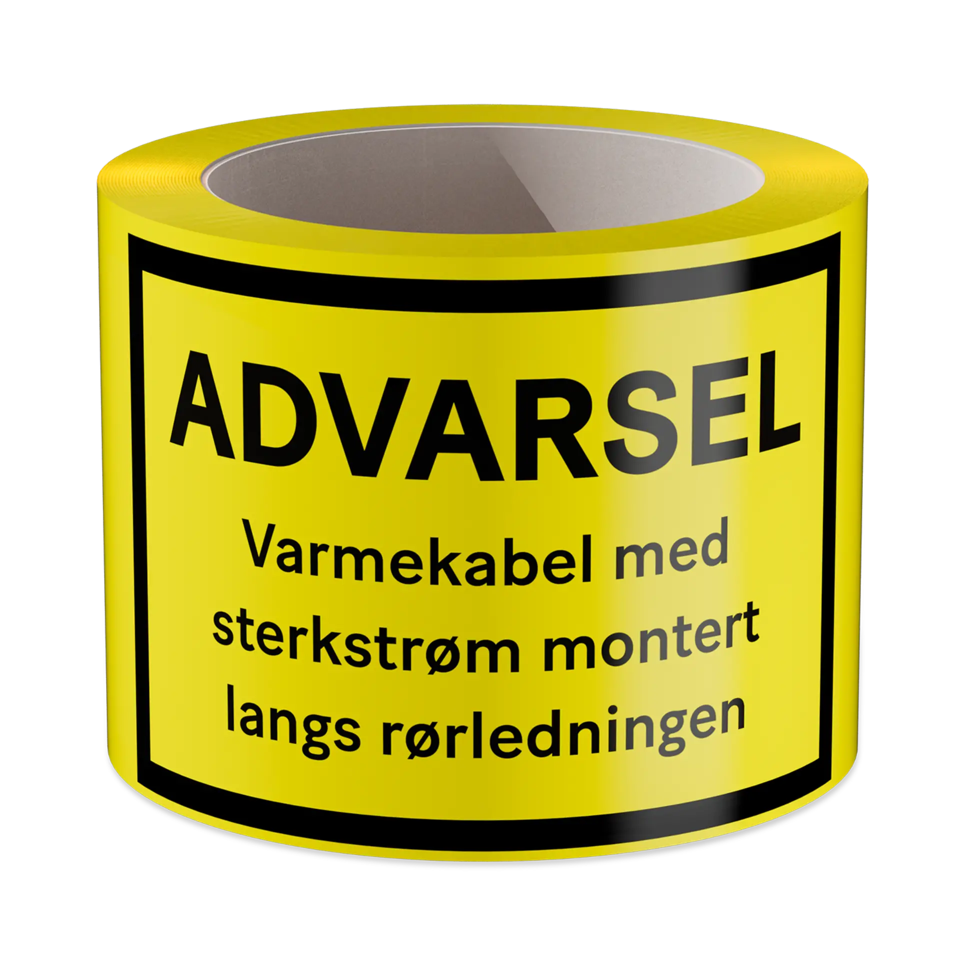 Gul varseltape for varmekabelanlegg. Informerer om at det er installert varmekabel på rør.
