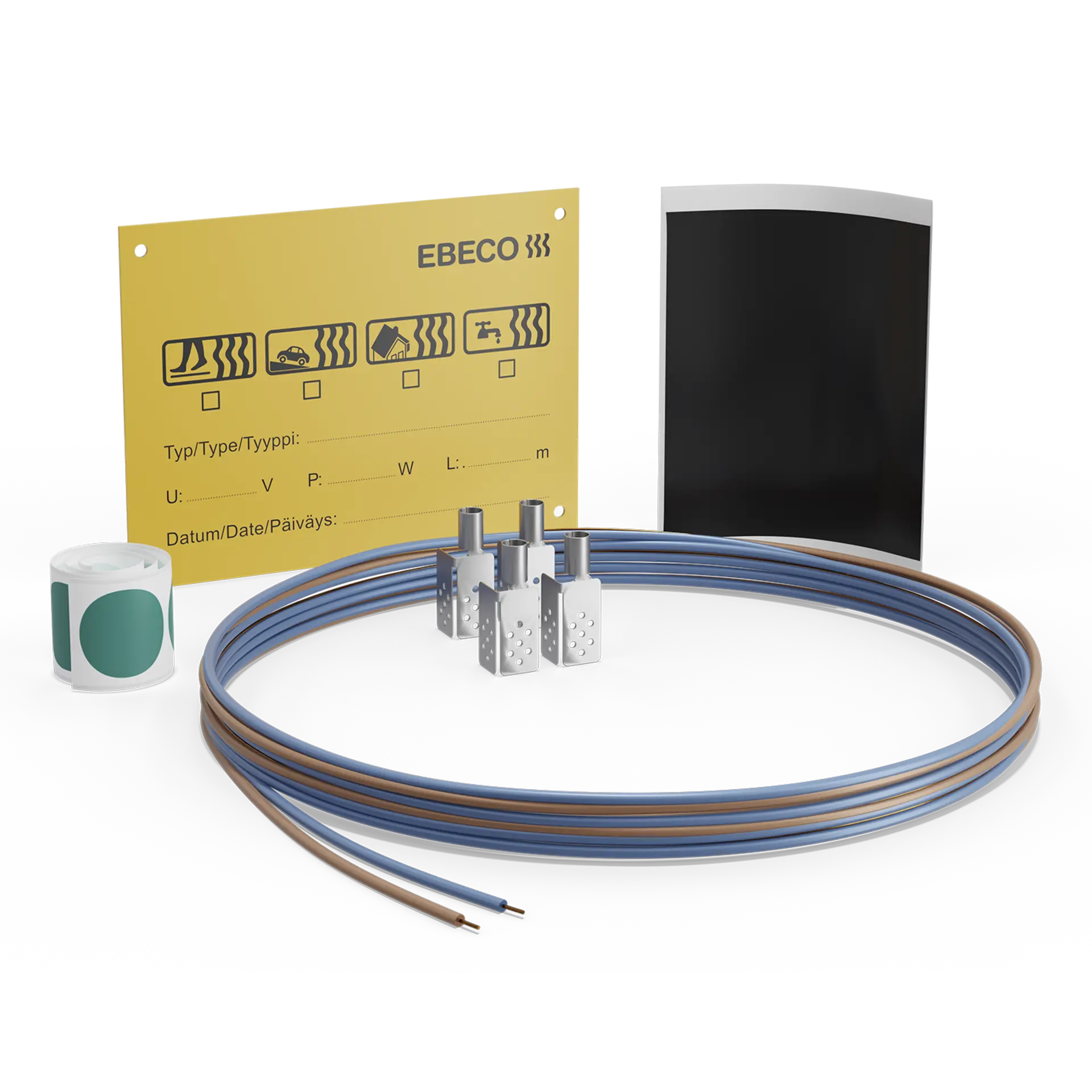 Komplett tillbehörssats för installation av Ebeco värmefolie för husvagn. Innehåll: dubbelisolerad RTK-kabel, anslutningsklämmor, isoleringstejp, förseglingstejp, gul skylt, dekal och monteringsanvisning.